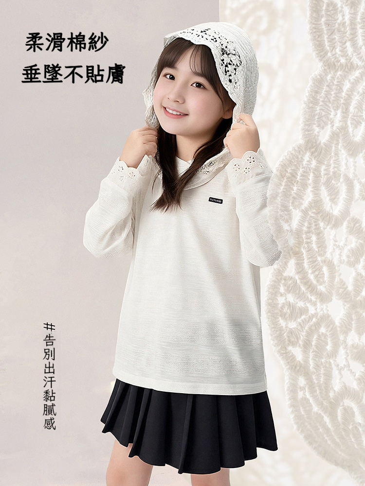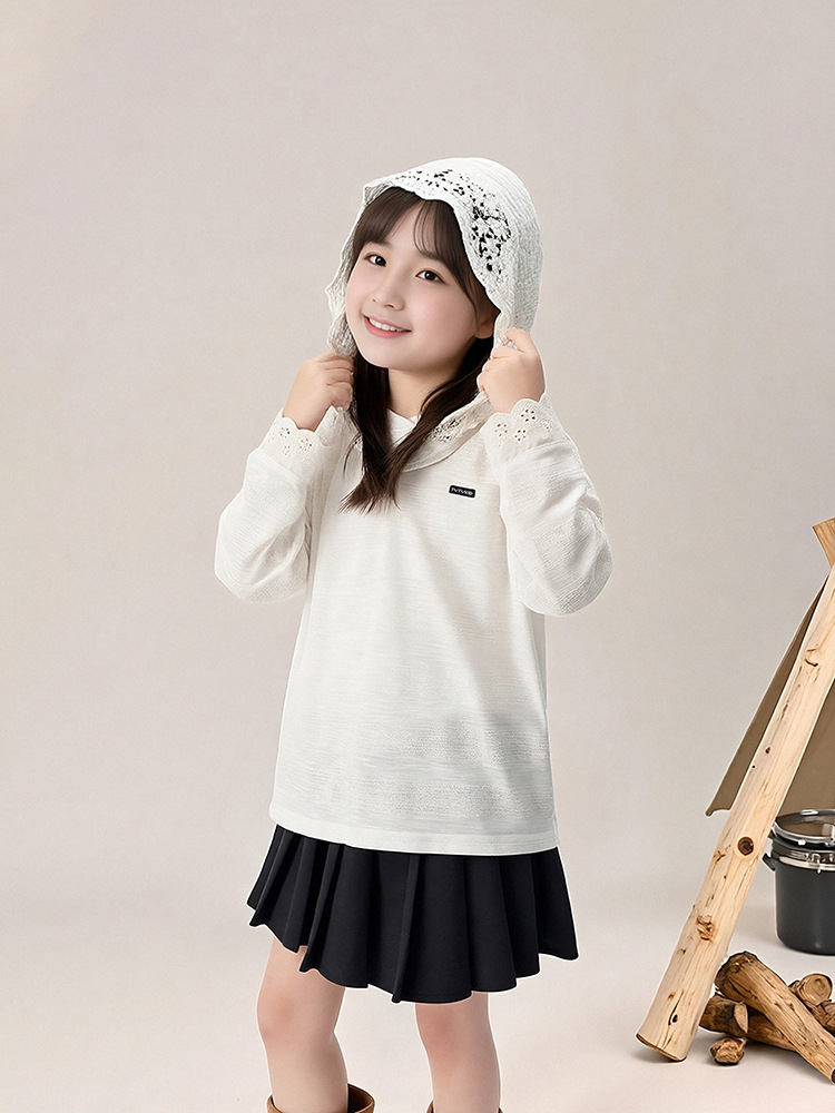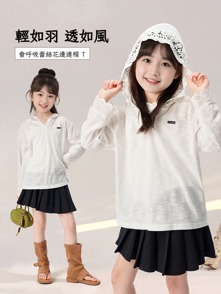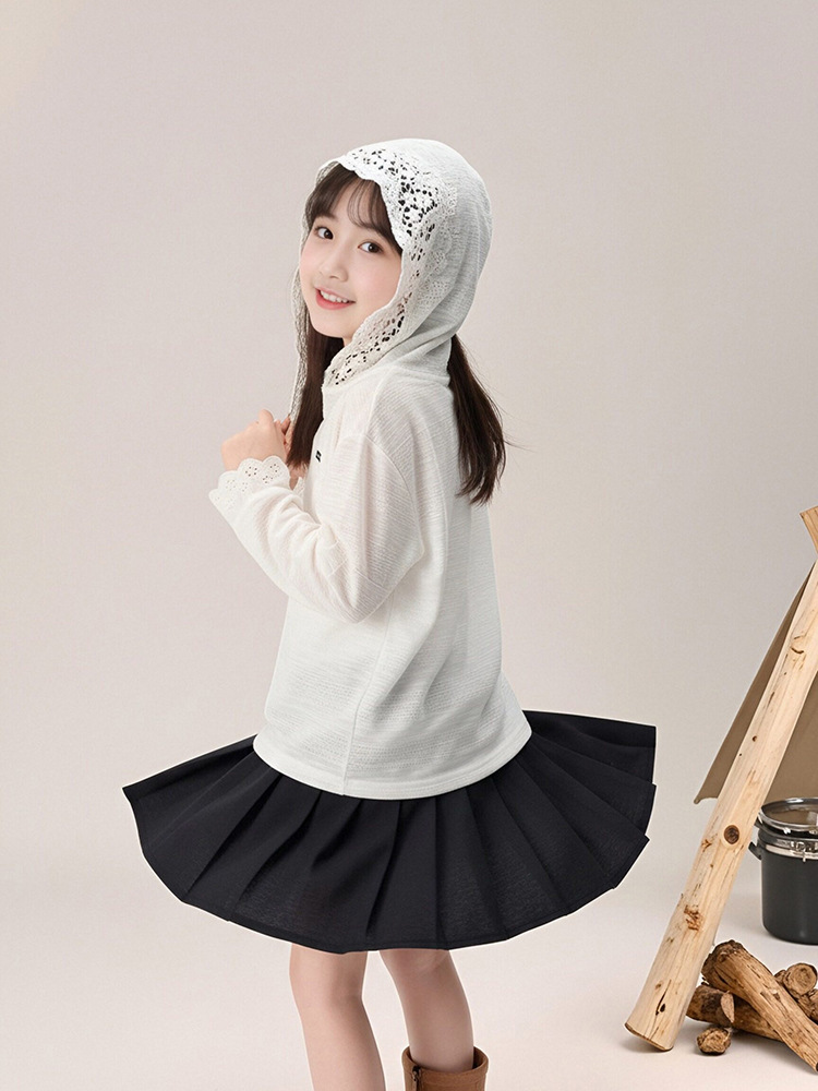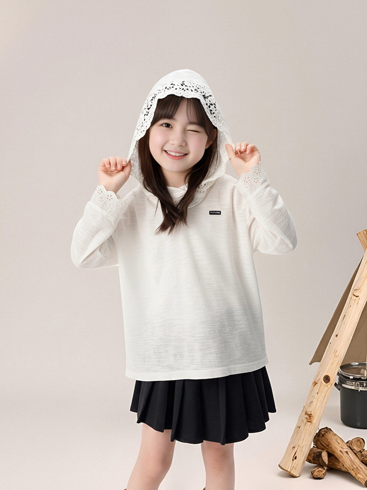 春秋款女童蕾絲長袖打底衫連帽上衣